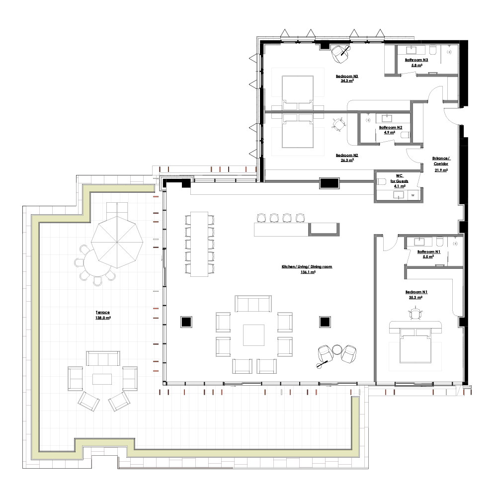 - Примечание: К зонам общего пользования Блока «С» относятся коридоры, вестибюль, парковка, технические балконы и помещения, крыша, лестничная клетка и террасы общего пользования.